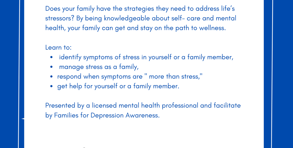 Does your family have the strategies to address life’s stressors? Join a mental health professional and a facilitator from Families for Depression Awareness for a virtual presentation on January 24th at 6:30 pm.