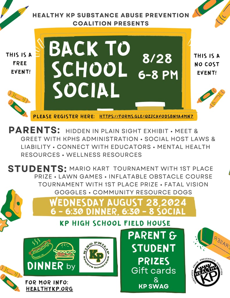NORFOLK — Superintendent Rich Drolet and Principal Nicole Bottomley are pleased to announce that the Healthy KP Substance Abuse Prevention Coalition (Healthy KP) is hosting a Back to School Social event on Aug. 28 from 6-8 p.m. at the KP Field House, King Philip Regional High School.