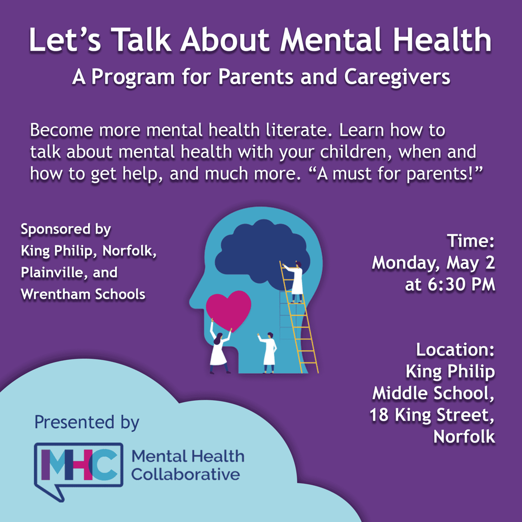 King Philip Superintendent Paul Zinni, Plainville Superintendent David Raiche, Wrentham Superintendent Allan Cameron, Norfolk Superintendent Ingrid Allardi, and Regional Director of Wellness Dot Pearl are pleased to announce that the districts will be hosting the workshop “Let’s Talk About Mental Health” for parents and caregivers.