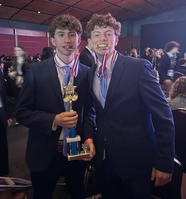 Sophomores Eli Hoyt and Nate Crowley, new members of KP DECA chapter, are now State Champions in Start-Up Business. (Photo courtesy King Philip Regional School District)