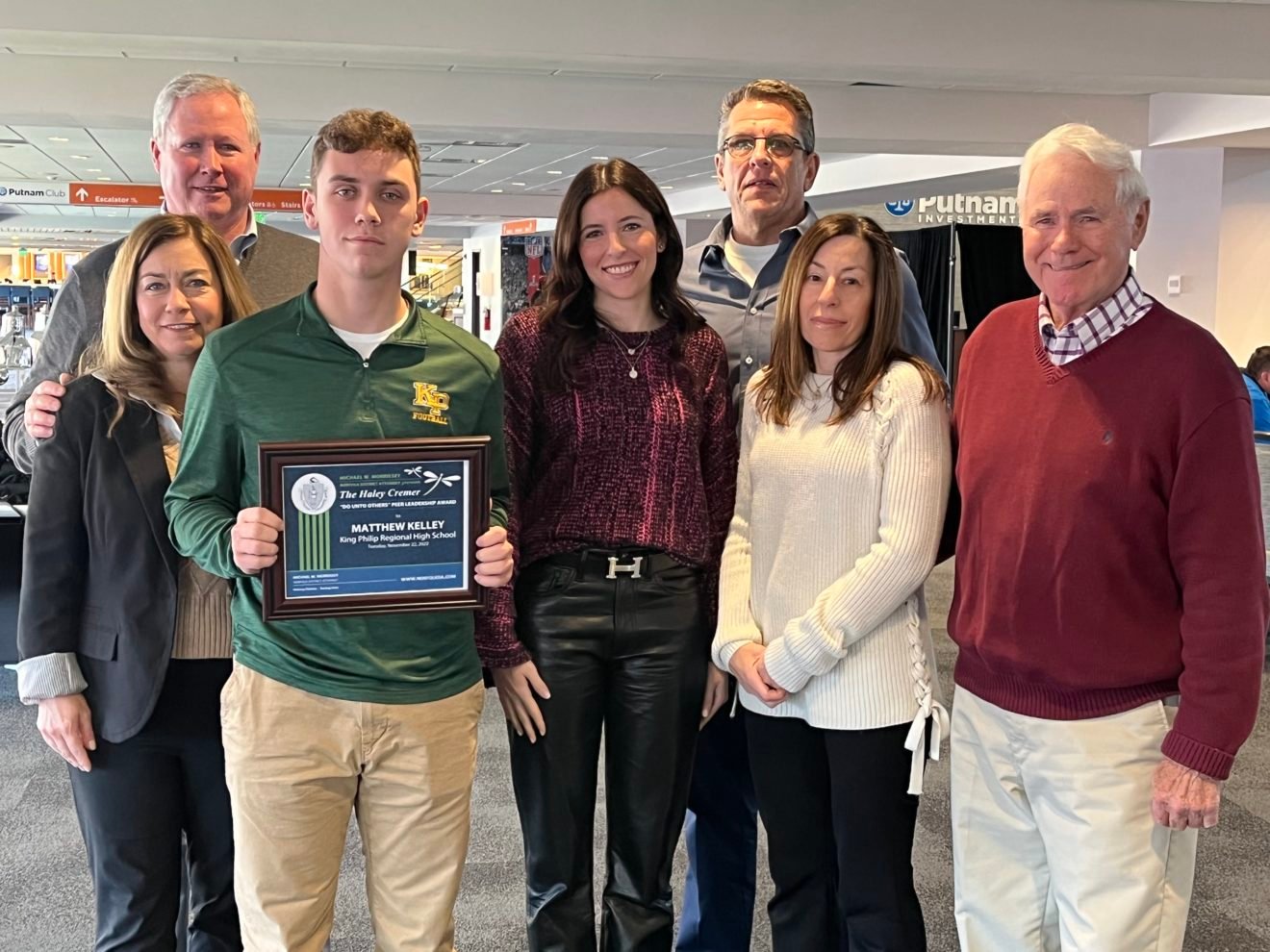KP Senior Matthew Kelley received the Haley Cremer “Do Unto Others” Award for Peer Leadership on Tuesday, Nov. 22, from Norfolk District Attorney Michael Morrisey at Gillette Stadium.