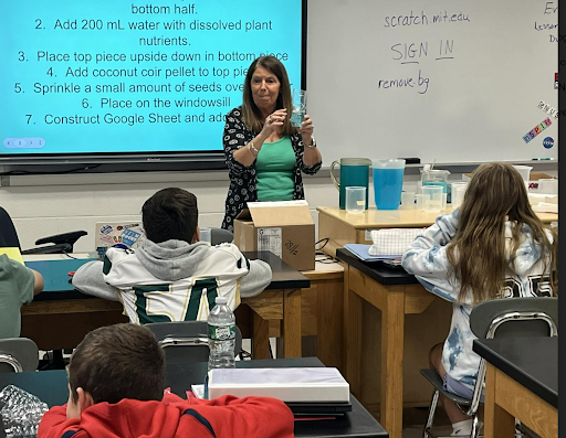 - King Philip Regional Middle School seventh grade STEM teacher Dr. Susan Hall explains Growing Beyond Earth Citizen Science experiment to seventh grade students. (Photo courtesy King Philip Regional School District)