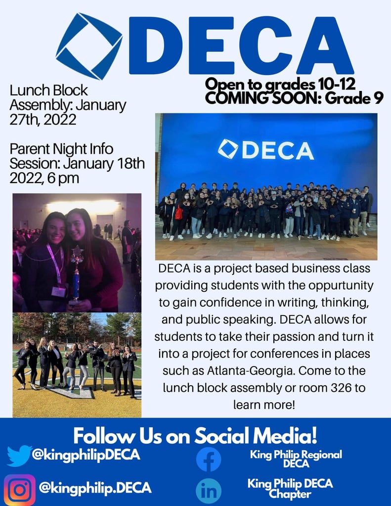 The King Philip DECA chapter will be hosting a Lunch Block Assembly on Thursday, January 27 and a Parent Night Information Session on Tuesday, January 18 at 6 p.m. Those interested in learning more about DECA are encouraged to attend!